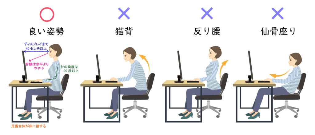 骨盤を立て、坐骨で座る。膝は股関節と同じかやや低く(椅子の高さ調整)